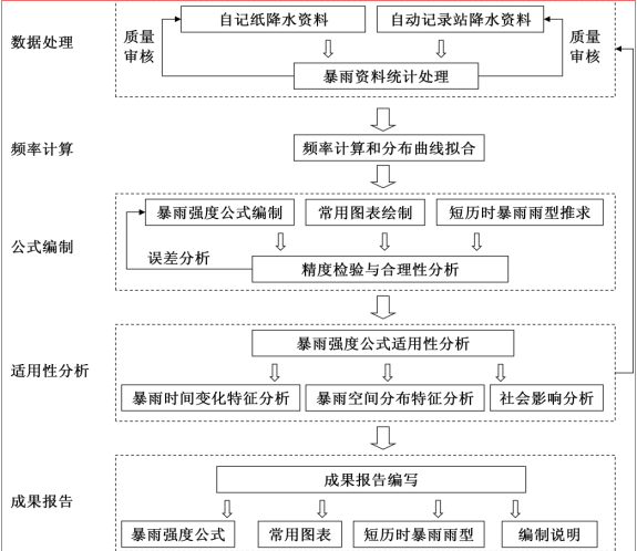 呼和浩特市暴雨強度公式編制的主要內(nèi)容包括資料處理、單一重現(xiàn)期暴雨強度公式擬合、區(qū)間參數(shù)公式擬合、暴雨強度總公式擬合、常用查算圖表編制、精度檢驗、各強度暴雨時間變化特征和暴雨強度空間分布特征分析等內(nèi)容,具體流程如下: