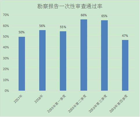 2019年第四季度我中心審查勘察報(bào)告共64項(xiàng)次,勘察報(bào)告一次性審查通過(guò)30項(xiàng)次,一次性審查通過(guò)率為47%,與往年勘察報(bào)告一次性審查通過(guò)率對(duì)比分析如下: