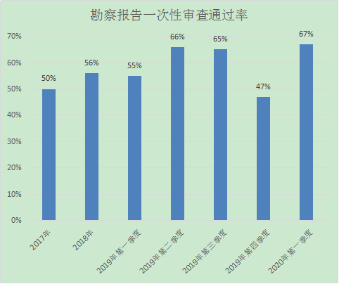 2019年第四季度我中心審查勘察報(bào)告共24項(xiàng)次,勘察報(bào)告一次性審查通過(guò)16項(xiàng)次,一次性審查通過(guò)率為67%,與往年勘察報(bào)告一次性審查通過(guò)率對(duì)比分析如下: