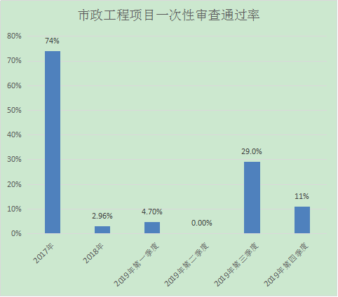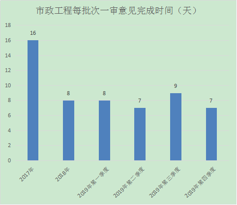 2019年第三季度我中心市政工程項(xiàng)目共審查9項(xiàng),一次性審查通過(guò)1項(xiàng),一次性審查通過(guò)率為11%;每批次一審意見(jiàn)完成時(shí)間為7天,與往年對(duì)比分析如下: