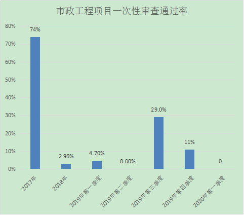 2020年第一季度我中心市政工程項(xiàng)目共審查1項(xiàng),一次性審查通過(guò)0項(xiàng),一次性審查通過(guò)率為0%;每批次一審意見(jiàn)完成時(shí)間為1天,與往年對(duì)比分析如下:
